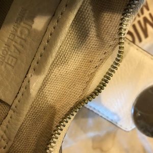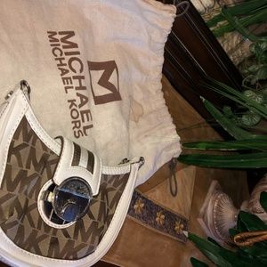 This purse is made of both canvas material as well as leather. It is a small shoulder bag purse that is tan and brown in color with silver metal hardware. The buckle is scratched up, but other than that, the purse is in very good condition. All flaws can be seen in the image. It is stored in a smoke and pet-free home.