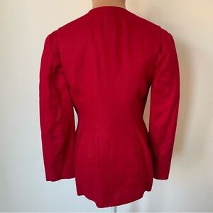 Elevate your wardrobe with this stunning Michael Kors vintage red two-piece jacket vest blazer set in size 8. Crafted from 100% linen. The set includes a matching vest and crop jacket, both in a vibrant red color, making it a great addition to any woman's wardrobe.