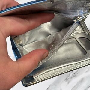 This vintage Y2K Michael Kors wristlet wallet doubles as a compact phone case and card holder, crafted in high-shine metallic silver embossed with MK monogram logos throughout. It features a snap flap closure, tan leather wristlet strap, ID window, interior card slots, and a silver lining with zippered coin pocket. The metallic finish gives it an iconic early-2000s aesthetic, perfect for collectors or everyday glam. The interior shows minor wear with some rubs and scuffing on the zipper pull, but the structure and exterior remain in good condition. Fits slim phones and essentials securely.