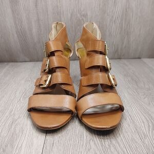 Michael Kors Viola Mid Sandal Heels Strappy Buckle Tan Luggage Caged Size 10.5