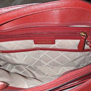 Michael Kors Voyager Medium Tote. Color is Brandy. NWOT, minimal wear on the feet on the bottom. Top-zip tote bag, logo-print twill, Gold-tone hardware, 16.5"W X 10.5"H X 6.25"D, Shoulder straps: 8.75", Interior details: back zip pocket, padded center zip compartment with 2 slip pockets, 2 front slip pockets, Lining: 100% polyester, Zip fastening. Dust bag included. Style # 30F8GV6T8B.