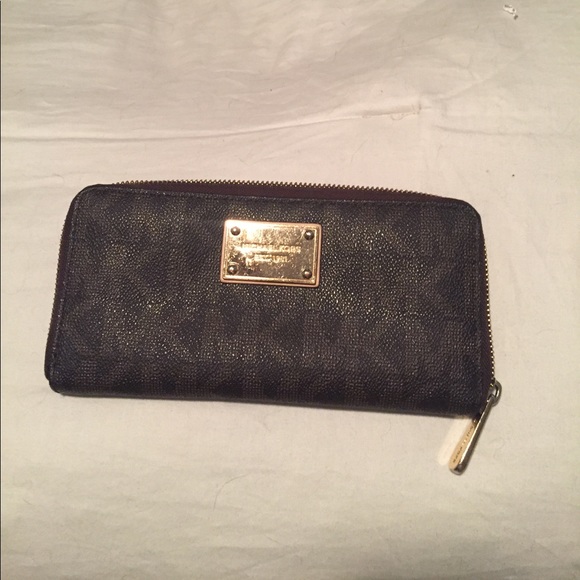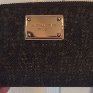 Authentic Michael Kors large wallet. Brown leather logo, quality leather. Large wallet with pockets and zippers.