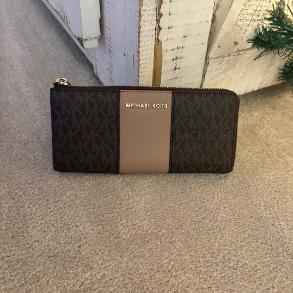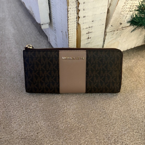 Michael Kors wallet… brown and pink… with gold hardware and lettering… gently used… no stains…. No damage… inside on both sides of the wallet or card holders for plenty of storage of cards…. Zippered pouch for coins…. The perfect go to wallet.