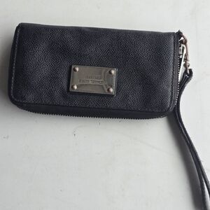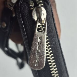 Stylish black wristlet wallet by Michael Kors. Features a sleek design with a convenient strap.This Michael Kors wallet for women is a stylish and functional accessory perfect for any occasion. With a zip-around design and multiple accents such as the brand's logo, rose and metal themes, this wallet is sure to catch the eye. It features credit card slots, an organizer, and folding capabilities to keep all your essentials organized.