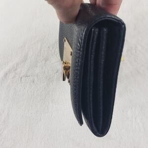 Michael Kors black pebble leather wallet with large gold plate and closure. Numerous inner card sleeves and zip change purse. Outer zip pocket as well. Logo lining in pockets