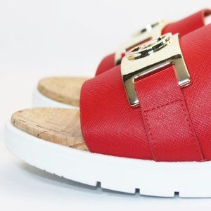 Chunky hardware with logo details adds a glint of metallic flair to the simple slide design of MICHAEL Michael Kors' Warren sandals.