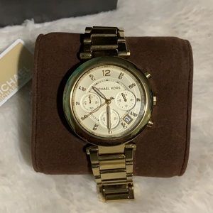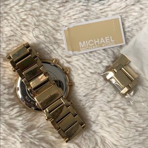 MK watch with box has been adjusted but includes extra pieces used in good condition need new battery