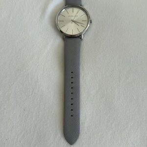 Stainless steel case with a grey leather strap. Fixed stainless steel bezel. Silver dial with silver-tone hands and index hour markers. Minute markers around the outer rim. Dial Type: Analog. Quartz movement. Scratch resistant mineral crystal. Pull / push crown. Solid case back.
