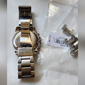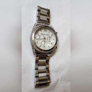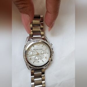 Michael Kors 7' Watch ⌚️ Beautiful watch. Has some scratches and one missing diamond on each side at the top of the handle where my fingers are pointing. Still in good shape, and it comes with extra links. No box.