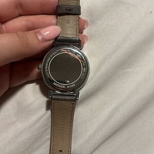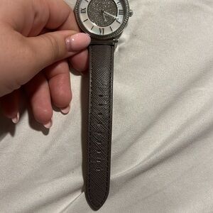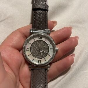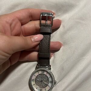 NWOT Michael Kors Watch. Features rhinestone face with mother of pearl dial. Strap is a gray color (looks like watch on the right side). Needs new battery. No scratches or imperfections. Comes with box.
