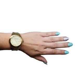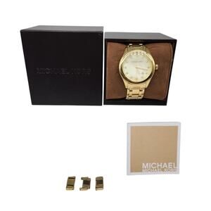 Very good condition gold plated stainless steel women's Michael Kors watch. Brand new battery, works as it should. Features a "champagne" mother of pearl dial with crystal hour markers. No wear on gold plating, some minor scratching. Some wear on pillow cushion. Comes with original box, manual and 3 extra links.