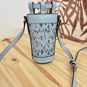 Michael Kors Water Bottle Crossbody Holder, often referred to as a "Pale Ocean" or light blue shade due to its color and signature logo pattern.