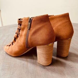 Beautiful caramel colored suede, woven ankle booties by Michael Kors with open toe and side zippers. Featuring chunky, 3” wood stacked heels with logo plaque. Great, lightly used condition.
