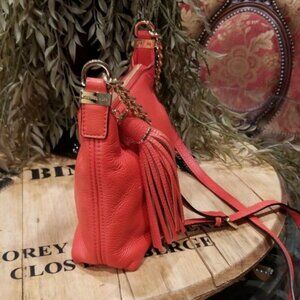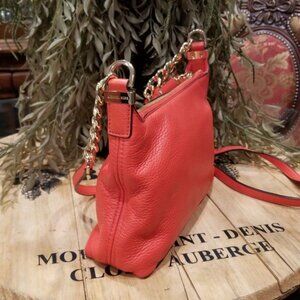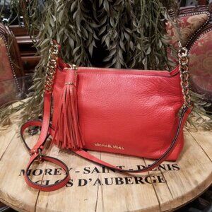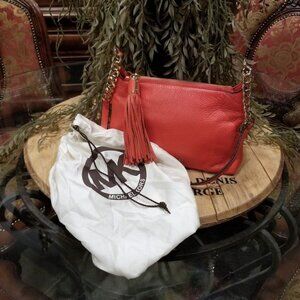 Beautiful Soft Pebbled Leather in Mandarin Orange ~ Gold Tone Hardware ~ Zip Top Closure with Tassel Pull ~ MK Logo in Gold at the Front ~ Adjustable Leather Strap with Chain Link Detail for Shoulder Wear or Crossbody ~ Interior Zipped Pocket ~ Three Card Slots ~ MK Dust Cover Bag Included ~ Approx. 7" High by 11" Wide at Bottom ~ Like New Condition ~ Used 2 Times ~ No Rips, Tears or Stains ~ See Photos ~ All Sales Final on Purses.