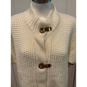 Michael Kors White Chunky Knit Short Sleeve Gold Buckle Cardigan, Size Large