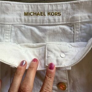 Chic and versatile white denim mini skirt by Michael Kors, perfect for dressing up or down! This A-line skirt features luxe gold hardware, side pockets, and a button-down front for a timeless, polished look.
