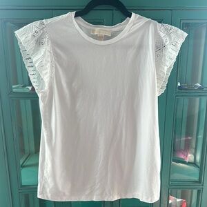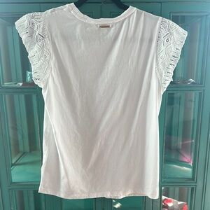 Elegant white tee with lace short sleeves. Perfect for casual elegance. Like new!