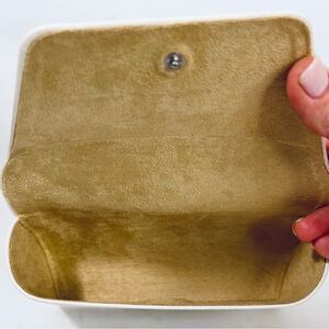 Hardshell case with flap foldover close. Beige felt interior, with brand name in silver lettering across front exterior. Exterior has one minor dent on back (red arrow drawn to show dent), only noticeable if you turn it at a certain angle, and very faint pink color smudge on back side. See last