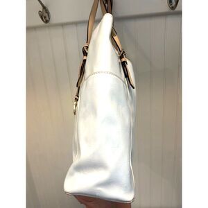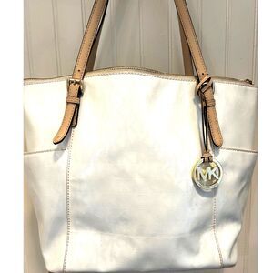 Michael Kors white tote bag with gold hardware and leather shoulder straps. The bag is in good condition with a couple of discoloration marks on the back of the bag and a few small stains on the interior. The leather, hardware and front of the bag look great. Measures 15" x 11" x 4".