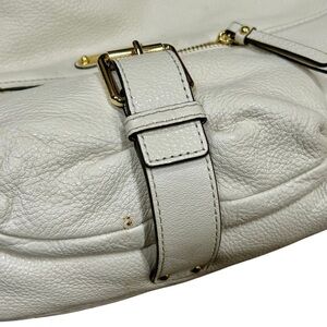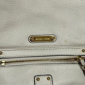 Classic and spacious Michael Kors hobo-style shoulder bag in white pebbled leather. This chic bag features gold-tone hardware, a front buckle detail, front zip pocket, and dual shoulder straps for comfortable everyday wear. The interior is fully lined with the Michael Kors logo fabric and includes a zip pocket and multiple slip pockets for organization.