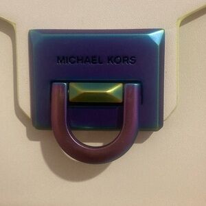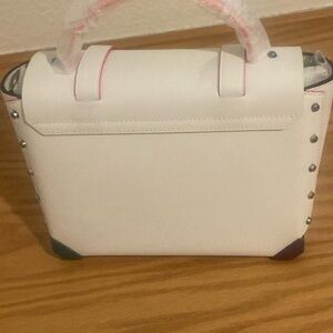 Chic Michael Kors satchel in white with striking purple details. Features studded sides and a stylish handle.