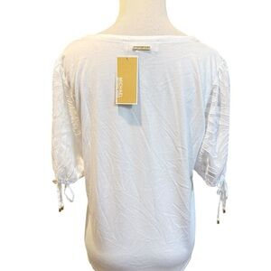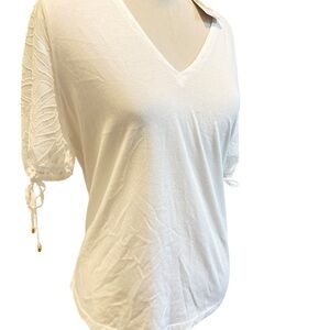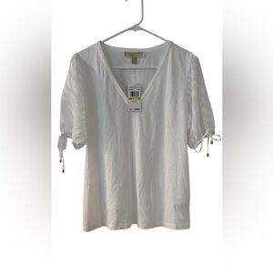 Michael Kors has a brand new soft V-neck top with a tag and a gorgeous design on the sleeve. This chic white blouse has a V-neckline and stylish tie sleeves. It is perfect for versatile styling. Brand New with an attack, soft, and gorgeous design and sleeve.