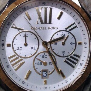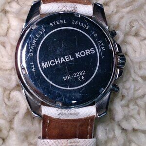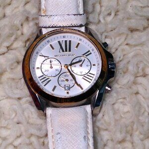 Michael Kors White Watch, Stainless, Fairycore, Leather Band, Girlhoodcore, Chic. Great watch for all styles of dress. Stainless, Style#2287, Great condition, Gently Pre-loved. Approx. 40mm diameter face. Date, Time, Time Zones. Needs nothing... Band shows wear on leather, but still in GREAT shape. NO BOX