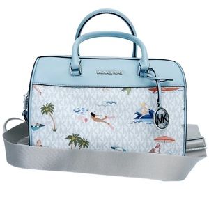 Chic Michael Kors satchel. Features white and blue design. Elegant and stylish for any occasion.