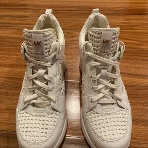 hese Michael Kors White Woven Wedge Comfort Sneakers, designed for women who appreciate both luxury and everyday comfort. Crafted with a combination of genuine leather and quality man-made materials, these shoes feature a stunning woven design on the side panels and toe for added breathability and a unique texture. The elegant gold-tone accents and Michael Kors logo hardware on the heel lend a sophisticated touch, elevating any casual outfit with a hint of designer flair. These sneakers are built for lasting comfort, featuring a supportive platform wedge heel and padded collar. The durable rubber outsole ensures secure traction, making them ideal for daily wear.Easy to slip on and adjust with the lace-up closure, these sneakers provide reliable fit and versatile style for all seasons. They’re in perfect condition gently used regular signs of wear please see all photos carefully and feel free to ask any questions.