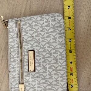 Stylish Michael Kors wristlet in white and tan. Perfect for any occasion with its sleek design and convenient wrist strap.