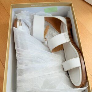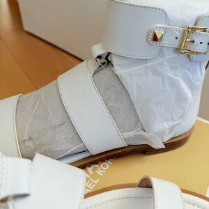 Crafted of leather, MICHAEL Michael Kors flat t sandals feature a curved vamp and gold tone buckle closure.