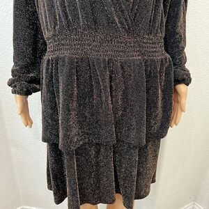 Michael Kors Womans Dress Sz 0X Bwown Gold VNeck Long Sleeve Ruffle Midi Stretch