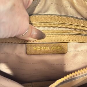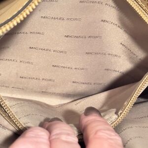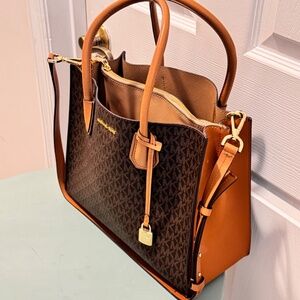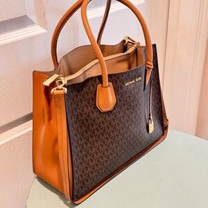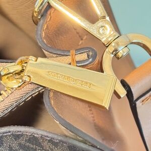 Michael Kors woman's logo handbag. In chocolate brown and tan. Handles and shoulder strap. Zipper center enclosure. Leather and cloth interior. Two interior zipper enclosures. No stains. No wear. Condition is excellent. Measures 12 1/2" length, 5 1/4" width, 10" high.