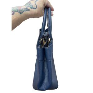 Elevate your style with the Michael Kors Navy Blue Saffiano Leather Satchel Crossbody. Perfect for any occasion, this elegant accessory combines functionality with timeless design. A very small dot stain middle interior pocket is all I saw wrong with this purse. There are no other defects and shes a beauty. I ship same day if ordered before 2pm Eastern Time. SKU 9525