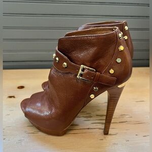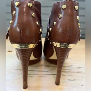 Michael Kors Women Ailee Brown Ankle Boots Size 7 M Open Toe Peep Gold Studded