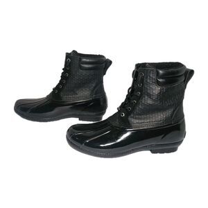 The Michael Kors Women Easton Lace-up Winter Duck Boots in size 10M are a stylish and functional choice for cold weather. These boots feature a round toe, lace-up closure, and mid-calf shaft style, providing a comfortable fit. With a faux fur lining and insulated design, these boots are perfect for winter activities such as travel, activewear, and casual outings. The black leather upper, quilted logo accents, and water-resistant outsole make these boots both fashionable and practical for all seasons.