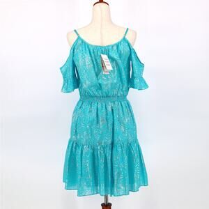 Michael Kors Women Turquoise Cotton Abstract Cold-Shoulder Ruffle Dress Size XL