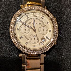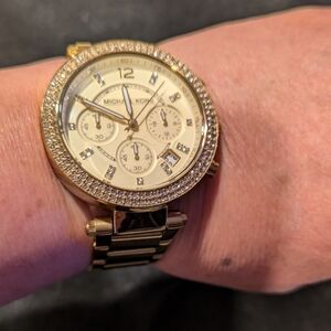 Pre-owned Michael Michael Kors Women's watch. Gently worn but does have normal wear scratches under the watch and on the band. No Major scratch. No chips or cracks and the watch looks nice. New battery has been replaced and watch runs well. Can't find the box so extra links and booklet are not included. Band circumference 6.5". Please make sure the band fits you before purchase.