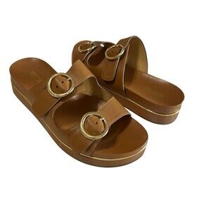Michael Kors Womens 7M Leather Tan Double Strap Buckle Platform Slide Sandals
