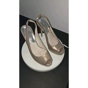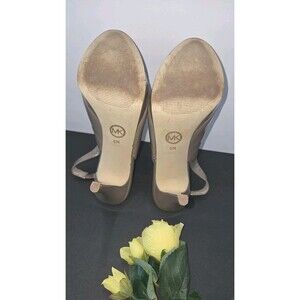 Women's Michael Kors Beige, Tan, or Neutral Patent Leather Stilettos. Peep Toe front and slingback elasticized strap for secure fit with silver button on back. High heels, 4". Size 6M. Perfect elegant sexy shoes for cocktail parties, weddings, formal occasions, or date night. Pre-loved in excellent condition with no outside scuffs or marks. Some light wear marks on inside as shown in picture.