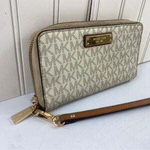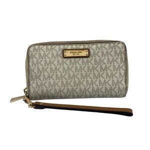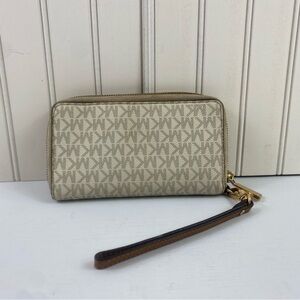 Michael Kors Women’s Beige Signature MK Monogram Logo Zip Up Wristlet Wallet
