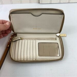 Stylish and versatile, this Michael Kors wristlet wallet in beige is perfect for any occasion. Has space for a small phone, receipts or a checkbookFeaturing the iconic MK logo, it combines elegance with functionality.