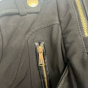 Chic black belted jacket. Has a hidden rain hood in the collar. The sleek design and gold accents elevate even the casual outfits! Pair it with jeans, work outfit or even sweats!