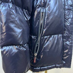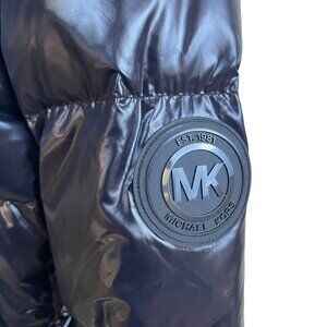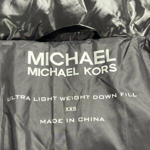 Michael Kors Women's Black Nylon Puffer Jacket Zip-Up With High Collar XXS. Elegant and practical design, warm down filling, stylish glossy exterior, and multiple functional zippered pockets. Lightweight and durable, featuring an adjustable hemline. In excellent used condition with no flaws or defects. Ideal for cold weather.