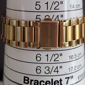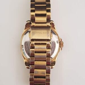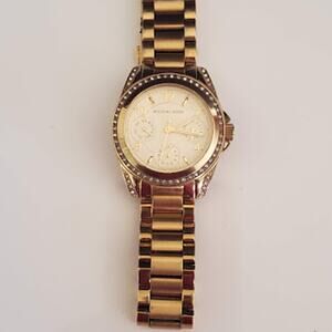 Michael Kors ladies watch is gold tone with a champagne dial surrounded by crystals. The band shows wear that can be seen in pics but the watch itself is in very good condition with no scratches on the crystals and all stones intact. Currently running with a fresh battery.