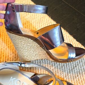 Step out in style with these chic Michael Kors wedge sandals. Featuring a sleek bronze design, these shoes are perfect for any occasion. Enjoy comfort and elegance with every step. New never worn 5 inch wedge zip ankle strap. Please see all pictures all sales final.