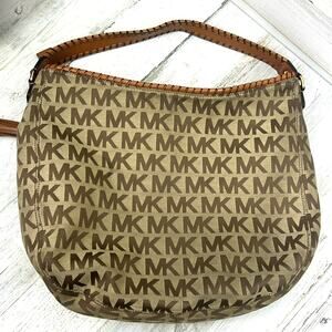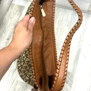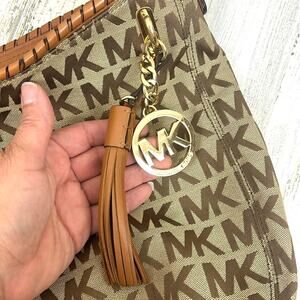 Michael Kors bag, brown leather purse, boho shoulder bag, MK logo handbag, braided strap tassel bag, Michael Kors women’s accessories, designer brown purse, boho chic leather handbag