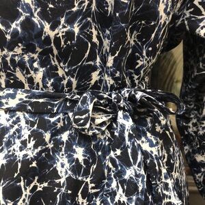 Navy, Blue, White marble art deco type design. Adjustable 3/4 sleeve with MK Silver Colored Logo Squares on Ties. Peek - a - boo shoulders, pencil skirt bottom midi dress.