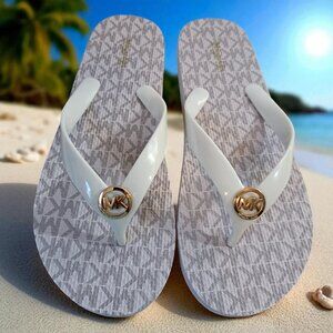 Showcasing a graceful cream shade accented by radiant gold details, these flip flops elevate the classic silhouette with a luxurious twist. The gleaming gold MK logo, delicately set on the strap, reflects the signature Michael Kors aesthetic—understated yet instantly recognizable. Their contemporary design ensures a seamless transition from poolside lounging to city strolls. Whether paired with a breezy sundress or your favorite denim shorts. Ideal for beach escapes, afternoon brunches, or simply enjoying the sunshine, they offer the perfect blend of casual chic and luxurious flair. New without tag