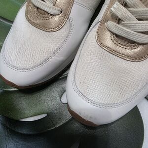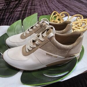 Elevate your look with these stylish Michael Kors sneakers. Cream and gold accents add a touch of luxury. Ideal for casual wear. Never been worn, only around the house to get a feel